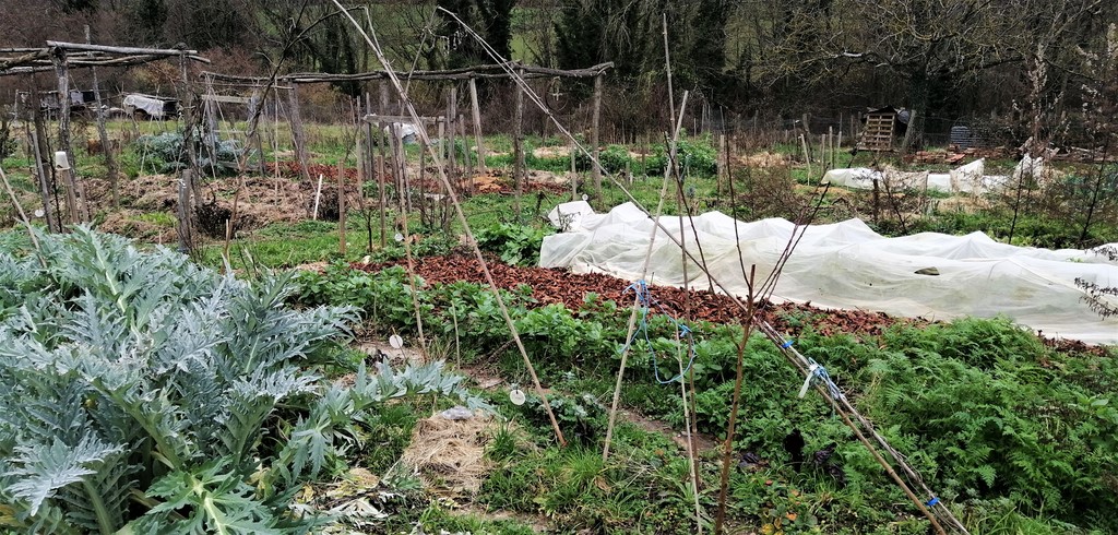 Depuis plus de 15 ans, nous sommes sur le lieu actuel, baptisé Terre-à-terre. C'était une vieille ferme à restaurer entièrement (voir photos). Nous avons d'abord habité un an dans une yourte avec nos 4 enfants, le temps de rebâtir le minimum. Aujourd'hui, le lieu comporte : l'atelier terre et arts plastiques, notre maison, la maison d'hôtes, l'atelier bricolage et forge, le caveau pour la vinification, les dépendances agricoles, une salle de pratique ... Notre énergie va aujourd'hui davantage dans les aménagements extérieurs avec le souci de participer à la régénération du vivant, notamment en plantant beaucoup d'arbes dans la dynamique des Jardin-forêts.
